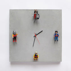 Brut d'horloge est un objet mural. Sur un fond de béton gris, de gros élastiques rouges s'adaptent pour les objets que vous mettrez en avant.